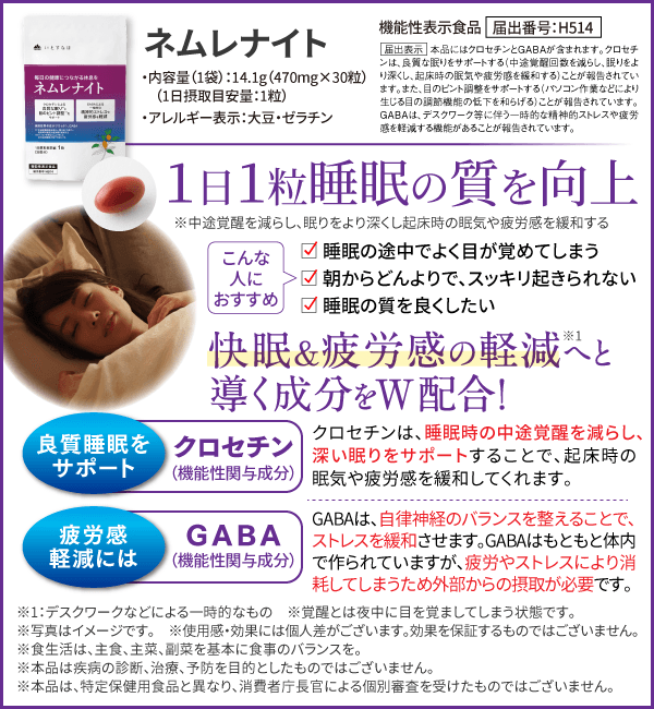 内容量/30日分 14.1g(470mgx30粒)(1日摂取目安量:1粒)・アレルギー表示:大豆・ゼラチン